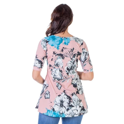 A stunning top with a beautiful soft pink and white floral print and a flattering flared silhouette. This comfortable maternity tunic top features a v shaped neckline with Henley style button detail, elbow length banded sleeves, a flared swing shape that ends with a hip length hemline. Perfect for professional day at the office look when paired with a blazer and can easily be styled for a casual look with jeans and cute sandals. Made from a comfortable stretch material in a polyester spandex blend.