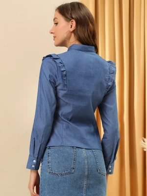 - Denim Blouse Shirt, Long Sleeve, Ruffle Trim, Stand Collar, Relax Fit
