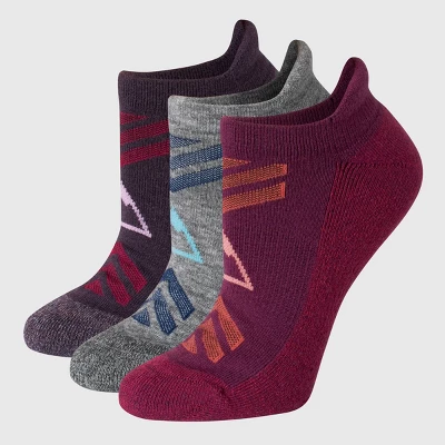 For comfort that keeps up with you and your active lifestyle. Designed with durable yet refined, comfortable fabrics to take you from mountain peaks to city streets. Made tough but soft where they need to be, HanesÂŽ Explorer Premium Mountain Peaks Women’s No Show Tab socks give you that top-of-the-mountain feeling â whether youâre on the trail or on the streets. Crafted from a sturdy blended fabric featuring natural wool yarns, Mountain Peaks socks keep your feet warm even when the weather turns. Reinforced in targeted areas for enhanced durability, they feature a cushioned foot bottom that softens the impact of hard surfaces. Knit-in arch support ensures a secure fit. Climbing mountains or navigating the concrete jungle can work up a sweat, but ventilating mesh panels and Cool ComfortÂŽ moisture-wicking fabric team up to keep feet cool and dry. Available in a value pack of three assorted colors.