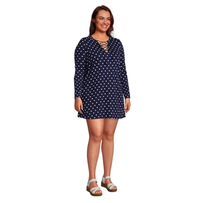 At Lands’ End we believe every body is a beach body. But there are still times when you need something to wear over your favorite swimsuit and this gorgeous cotton dress is the perfect choice. Incredibly comfortable it provides modest coverage and has an eye-catching drawstring detail at the neckline. The three-quarter length sleeves have functional tabs that let you quickly adjust their length and it hits above the knee so it’s easy to move around in but still looks like a stylish dress. Pair it with strappy sandals bohemian sunglasses and a woven tote and you have chic look that’s perfect for lounging poolside or grabbing lunch in a cute cafe. Of course it’s also great for wearing over your bikini halter tankini or one-piece bathing suit on the drive home from the lake. And since it’s made from pure cotton this packable lightweight and breathable ladies swim coverup dress can be tossed in the machine with the rest of your laundry. No special care is required.