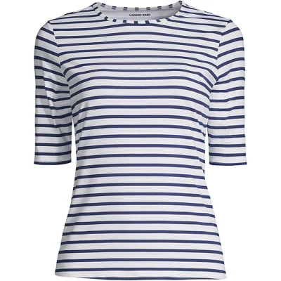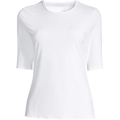 At Lands’ End we believe every body is a swimsuit body and everybody should feel confident in their swimwear. Our Women’s Crew Neck Elbow Sleeve Rash Guard Modest Swim Tee is no exception. Lightweight soft and just stretchy enough it’s designed to be worn over other swim suit tops letting you control the amount of coverage you want. Made with LYCRA Xtra Life spandex this suit is specially designed to keep its shape in and out of the water and hold up against chlorine sunscreen and sweat all summer long. Plus it lasts longer than those other spandex suits you’ve owned in the past and it offers UPF sun protection wherever it has you covered. With special modest design features like a high crew neck elbow length sleeves quick dry moisture wicking fabric and a soft and stretchy nylon blend you’re guaranteed to make waves this summer at home the beach or on vacation. Whether you live in two pieces or are partial to a one piece we promise you’re going to love this fun and flattering crewneck long sleeve modest swim tee.