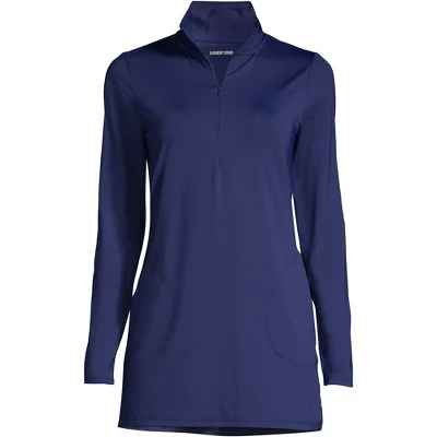 Every body is a beach body. But at Lands’ End we know there are still times when you need to cover up! Whether you want shade from the midday sun or just like to slip something on when you feel chilly this Women’s Quarter Zip Long Sleeve Tunic Rash Guard Cover-up will do the job. Made from stretchy Lycra it moves with you – never against you – and has a quarter zip that makes it easy to take on and off. The handy side pockets offer a place to keep your sunglasses lip balm and other must-haves. It also wicks away moisture making it great for hot humid days when you can easily work up a sweat. Perfect for travel this womens swimsuit cover-up is great over a bikini tankini or tank suit. It will keep your upper half protected from the sun and it even provides UPF protection that doesn’t wash away or pollute the ocean. Take it along on your next adventure and you’ll always have the right thing to wear whether you’re relaxing on the deck of a boat or by an outdoor pool. Take on summer’s best in comfort that’s sure to last.