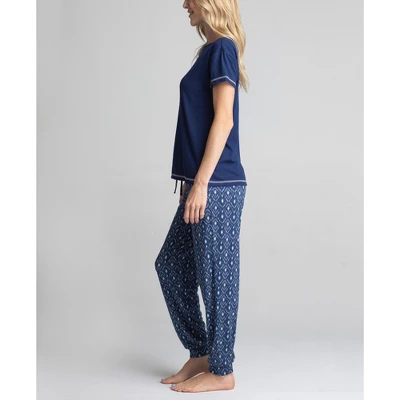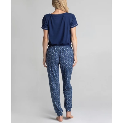 This sleep and lounge set features a 29″ pant in our Dream Knit fabric which is a soft, brushed and lightweight knit fabric. The pant is a jogger style. The top features a silky rib fabrication and contrast stitching. Machine wash/Tumble dry low. Cute to wear as a lounge set during the day and comfortable enough to wear to bed as pajamas