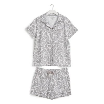 Matching pajama sets make for instant main-character-in-a-Nancy-Meyers-movie vibes. We suggest picking up multiple patterns! Details: 95% cotton, 5% spandex jersey knit. Printed with solid piping trim detail. Top is short sleeved with a button front. Patch pocket. Shorts have two slip pockets. Elastic waist with drawstring. 3 ½” inseam. Care Tips: Machine wash cold, gentle cycle, only non-chlorine bleach when needed; tumble dry low; cool iron, if needed
