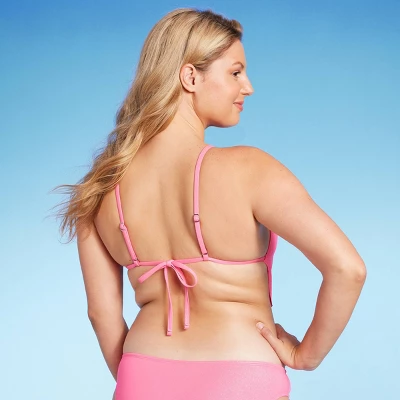 Bralette bikini top with longline design and cowl neckline. Made with soft, stretchy fabric featuring a full lining. Comes in pink with a slight iridescent shine. Adjustable-length spaghetti straps at shoulders and strappy back tie to secure the top. Cups are removable for customizable coverage.