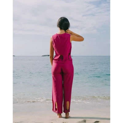 MIGA Swimwear’s Marije Cutout Top in Magenta has a relaxed fit and a cutout detail at waist to keep you stylish post swim. This coverup top is made with sustainable SPF 50 fabrics that protect your skin. Pair with the Ally Bikini Top, Ally Crossover Bikini Bottom and Marije High Waisted Cutout Pants. MIGA Swimwear surveyed over 400 women, including members of the disability community, to find their favorite styles. All of their swimsuits are made sustainably in the USA.