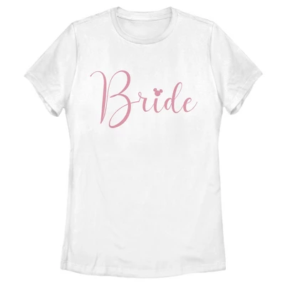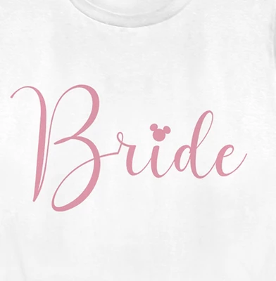 - Strut your stuff with this stylish new women’s t-shirt that is perfect for the bride’s celebration! Featuring the word: “Bride,” in cursive handwriting with the Mickey Mouse silhouette logo as the tittle of the letter ‘i’.