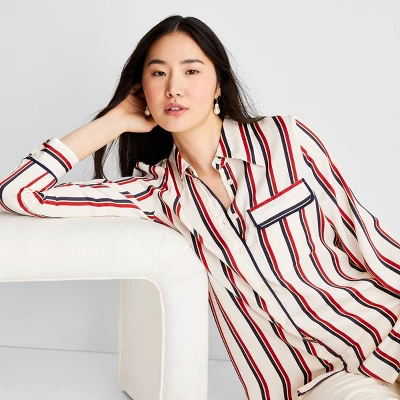 Make a cozy addition to your PJ collection with this Long-Sleeve Satin Pajama top from Future Collective™ with Reese Blutstein. Made from super-soft recycled polyester satin fabric in white, this long-sleeve PJ top features contrasting vertical red and navy stripes. Designed with a flat collar, a chest patch pocket and a full front button-down closure for a classic look, it can be worn tucked or untucked with any pajama bottoms thanks to its below-waist length.