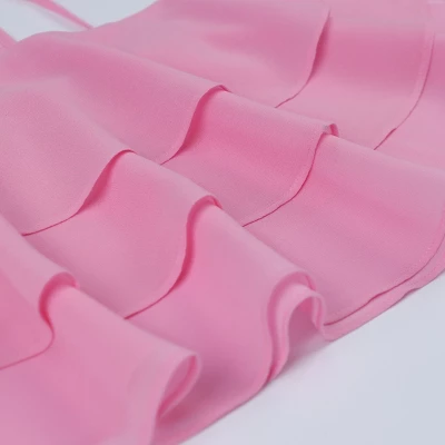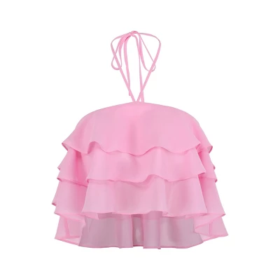 The tiered ruffle top is fun & flouncy with three tiers. Layers of chiffon make this halter ruffle top airy and easy. Spaghetti tie at neck and elastic at back for a secure fit. Wear it with the floral utility pant for a fun outfit that is perfect for those long summer nights.